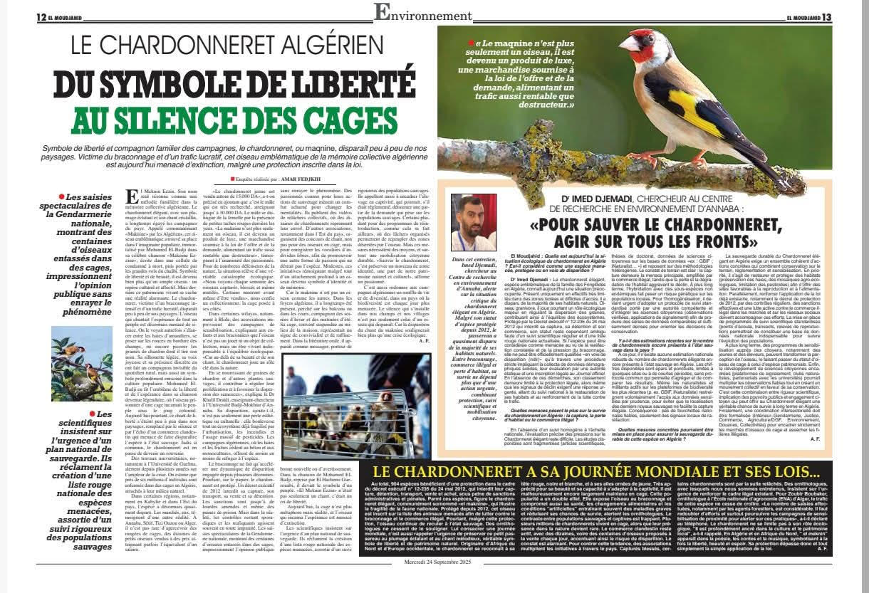 Article au journal : "Le chardonneret Algérien , du symbole de liberté au silence des cages" Article au journal : "Le chardonneret Algérien , du symbole de liberté au silence des cages"